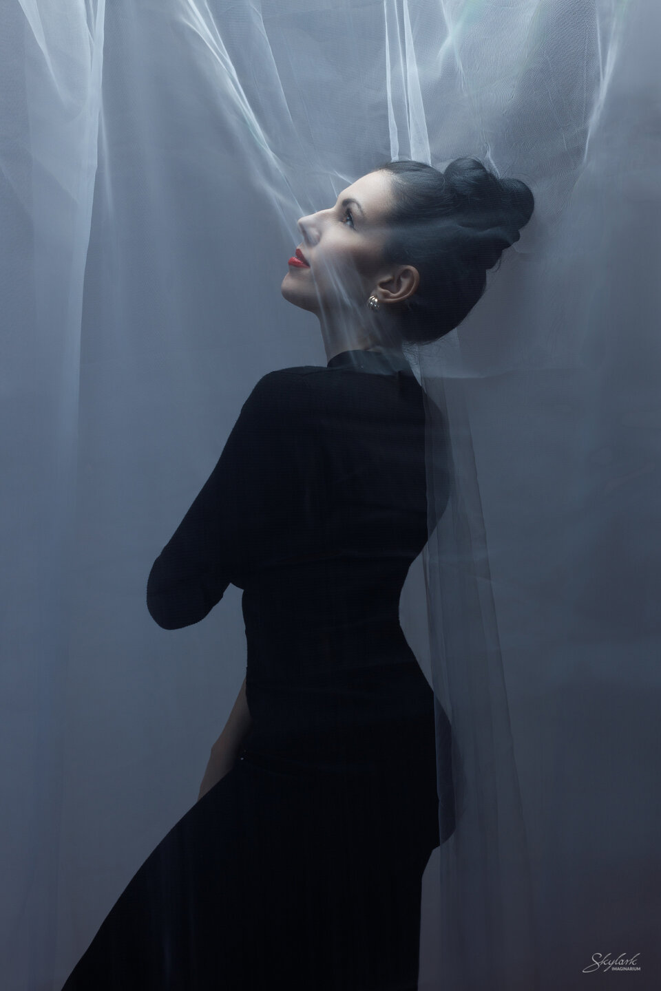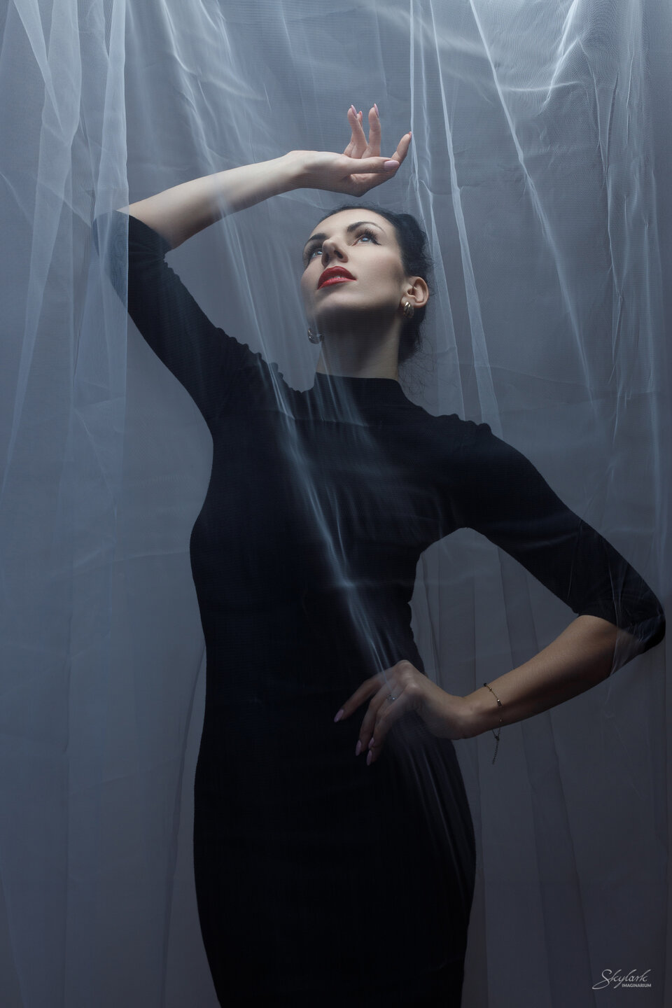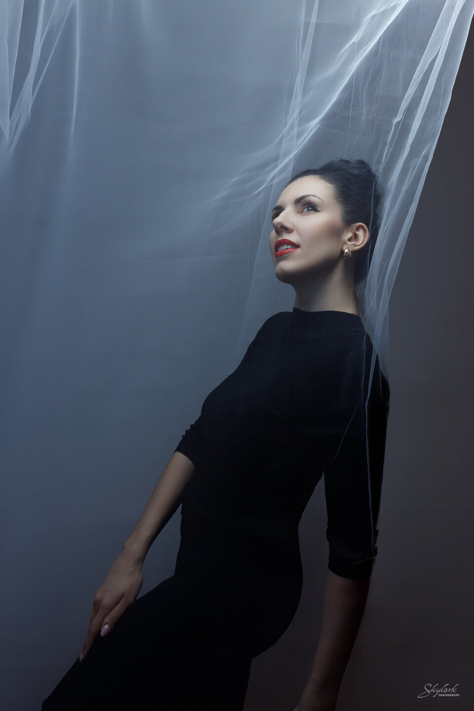 Na koniec wybłagałem Izę na jeszcze jeden, ostatni setup. Była już zmęczona, brakowało energii, ale dała się namówić na trend, który od jakiegoś czasu obserwuję — zdjęcia z tkaniną lub tiulem. Szybko zmontowałem prostą scenę i w kilkanaście minut zrobiliśmy kilka kadrów, które mnie osobiście bardzo się podobają. Może przez to zmęczenie, może przez talent Izy, a może przez cały ten klimat — zdjęcia wyszły z nutką tajemniczości, wręcz eteryczne. Mam nadzieję, że i Wam przypadły do gustu.